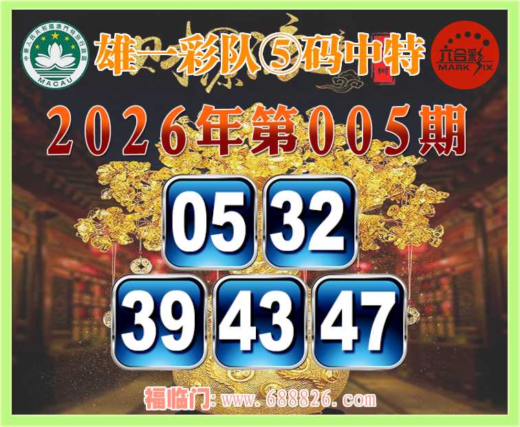 005期: ⌚『雄一彩队』⑤码中特⌚【05.32.39.43.47】开:43
